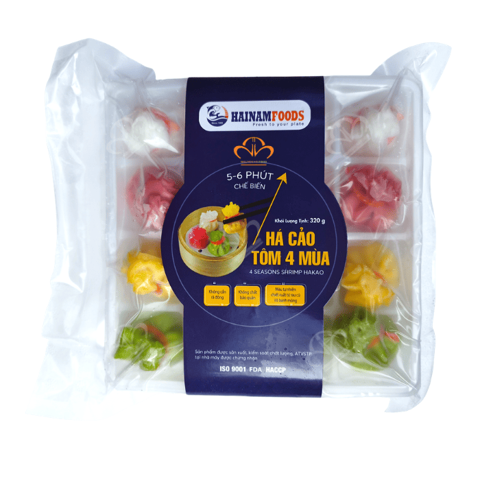 Há cảo tôm 4 mùa được chế biến từ nhân tôm thơm ngon kết hợp lớp vỏ bánh mềm mịn, nhiều màu sắc tự nhiên. Thiết kế “4 mùa” đặc trưng với mỗi viên há cảo có màu sắc khác nhau (thường từ rau củ tự nhiên), tạo cảm giác bắt mắt và hấp dẫn. Há cảo tôm 4 mùa không chất bảo quản, màu tự nhiên chiết xuất từ rau củ. Há cảo tôm 4 mùa thường dùng làm món ăn sáng, khai vị, ăn xế hoặc ăn vặt,...