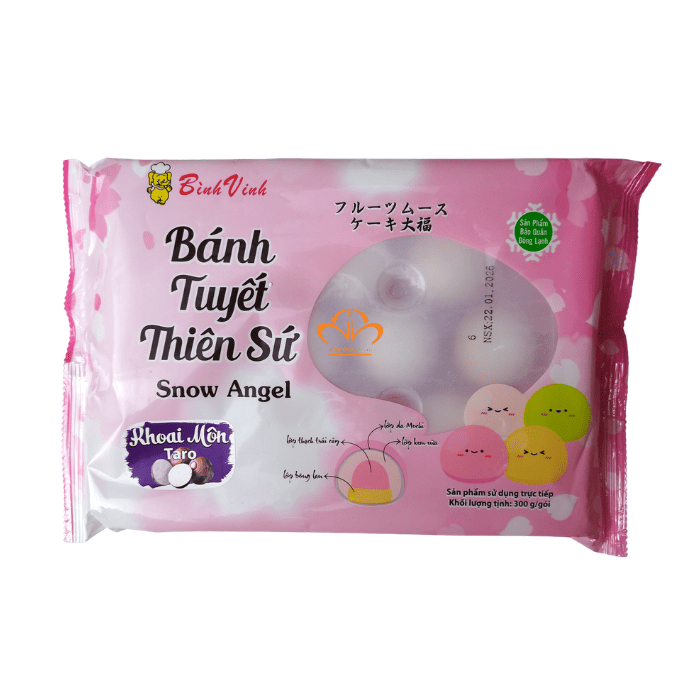 Bánh Tuyết Thiên Sứ vị khoai môn của Bình Vinh Sài Gòn là món bánh tráng miệng mát lạnh hấp dẫn với lớp vỏ mochi trắng mềm dẻo, mịn màng như tuyết. Bên trong là nhân kem sữa kết hợp khoai môn bùi béo, mang hương thơm đặc trưng và vị ngọt dịu dễ ăn. Khi thưởng thức, bánh tan nhẹ trong miệng, tạo cảm giác mát lạnh, mềm mịn và thơm ngậy rất hấp dẫn.