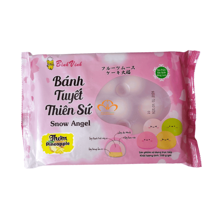 Bánh Tuyết Thiên Sứ vị thơm (dứa) của Bình Vinh Sài Gòn là món bánh tráng miệng mát lạnh hấp dẫn với lớp vỏ mochi trắng mềm dẻo, mịn như tuyết. Bên trong là kem sữa béo nhẹ hòa quyện cùng nhân mứt thơm có vị chua ngọt tươi mát, giúp cân bằng độ béo của kem sữa. Hương thơm đặc trưng của trái thơm tạo nên cảm giác sảng khoái khi thưởng thức.