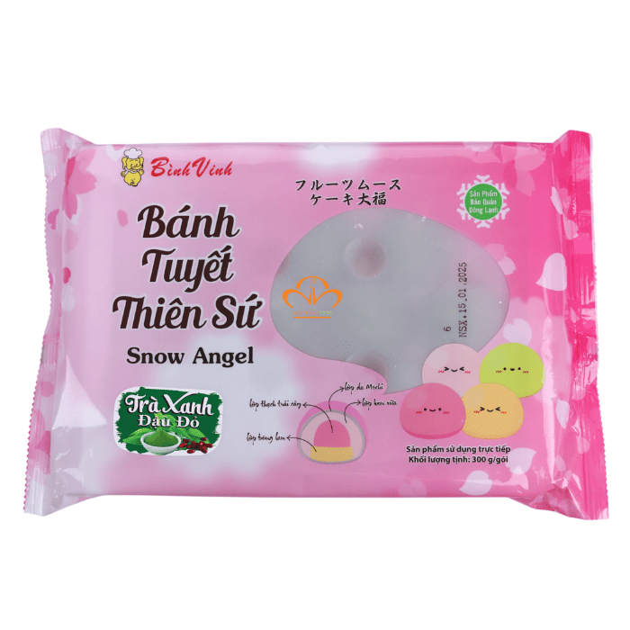 Bánh Tuyết Thiên Sứ vị Trà Xanh Đậu Đỏ của Bình Vinh Sài Gòn là dòng bánh ngọt mềm mang phong cách Á Đông, kết hợp hài hòa giữa vị trà xanh thanh nhẹ và đậu đỏ bùi ngọt.