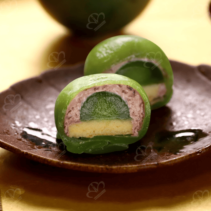 Mạch nha, nước, kem trang trí bánh, chất làm dày (INS 1422), trứng gà, đậu đỏ (3,4%), bột mì, đường tinh luyện, tinh bột bắp, dầu olein tinh luyện, shortening, chất tạo gel (INS 407, INS 425), chất điều chỉnh độ acid (INS 331), bột trà xanh (0,3%), chất nhũ hóa (INS 471, INS 475, INS 477, INS 491), hương liệu tổng hợp (hương đậu đỏ), phẩm màu tổng hợp (INS 120, INS 141(ii), INS 160a(i), INS 110, INS 133), chất ổn định (INS 500(ii), INS 450(i), INS 431(i)).