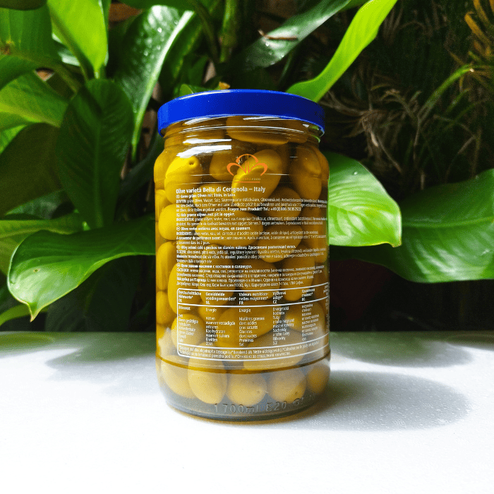 Trái oliu xanh nguyên hạt (75%), nước, muối, chất điều chỉnh độ axit, chất chống oxi hóa.